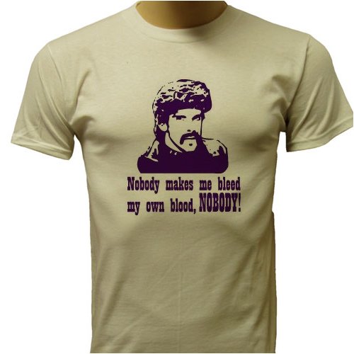 Nobody Makes Me Bleed My Own Blood T-shirt, Dodgeball T-shirt These hilarious t-shirts are made of a 100% fully machine washable cotton/poly blend for a cool and comfortable fit every time. They feature insanely funny phrases and pictures. Shocking and bold, stand out at the bar, school or just lounge around the house. NOBODY MAKES ME BLEED MY OWN BLOOD!! Hillarious line by Ben Stiller in the Classic move DODGEBALL.