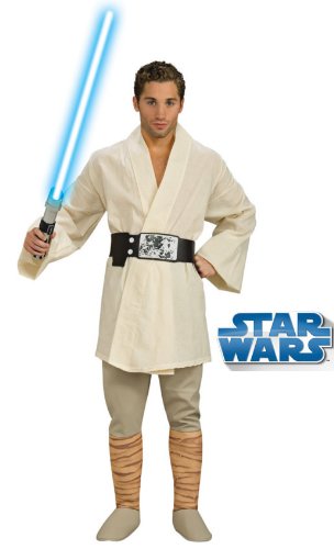 Leading the struggle against the Galactic Empire with this deluxe Luke Skywalker costume. Licensed Star Wars item. Costume includes: tunic, pants with attached boot tops and belt. Comes in two adult sizes: Standard and XL.